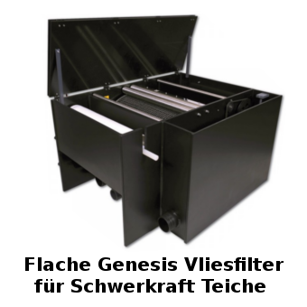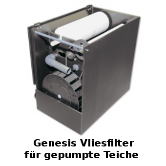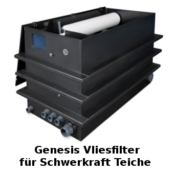 Teich. Mit der Zeit verstopft das Filtervlies immer mehr und der Wasserstand im Filter steigt an. Über einen Überlauf wird eine Mechanik in Bewegung gesetzt, die das Filtervlies automatisch und